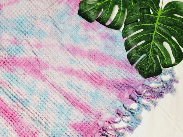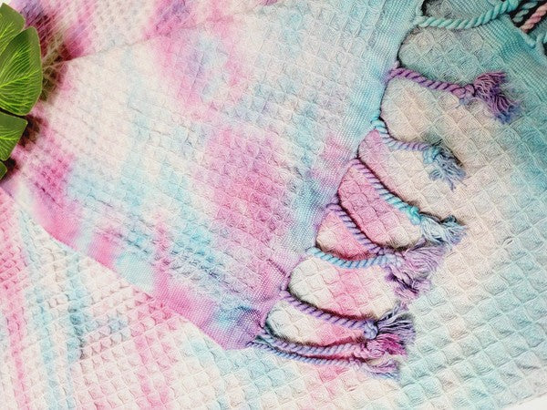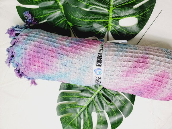 Discover the benefits of waffle towels, made from 100% organic cotton and hand tie-dyed in Turkiye. These versatile towels are perfect for use as bedding, in the spa, at the pool, or as a throw or blanket. Compared to traditional terry cloth towels, waffle towels feature a larger surface area due to their unique honeycomb design. Not only do they look beautiful, but their construction also makes them highly functional, trapping moisture and drying quickly. Lightweight and breathable, waffle towels will stay fresher longer and are the perfect alternative to plush cotton towels that can stay damp for hours. Our mission is to provide you with a lightweight, space-saving, and safe towel that dries you just as fast as a conventional towel