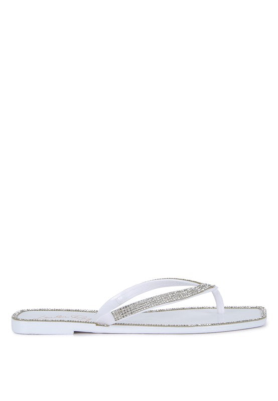 Water-resistant soft jelly flats with beautiful sparkling diamante detail studs along with the thong straps and edges. The casual, comfy streetwear flats look gorgeous on the feet.