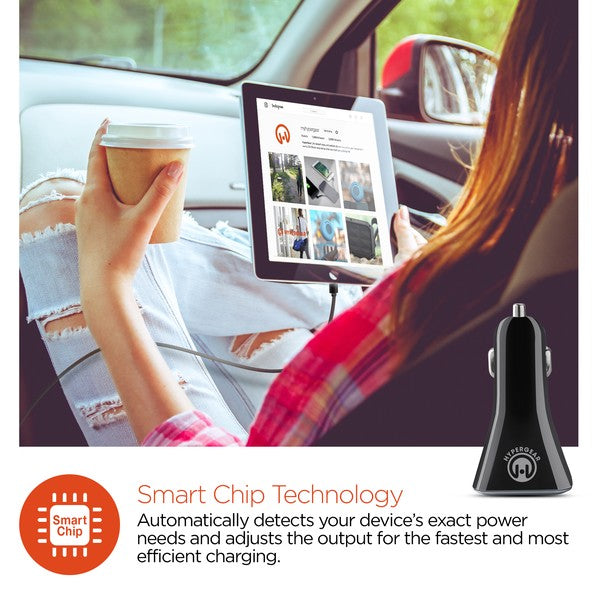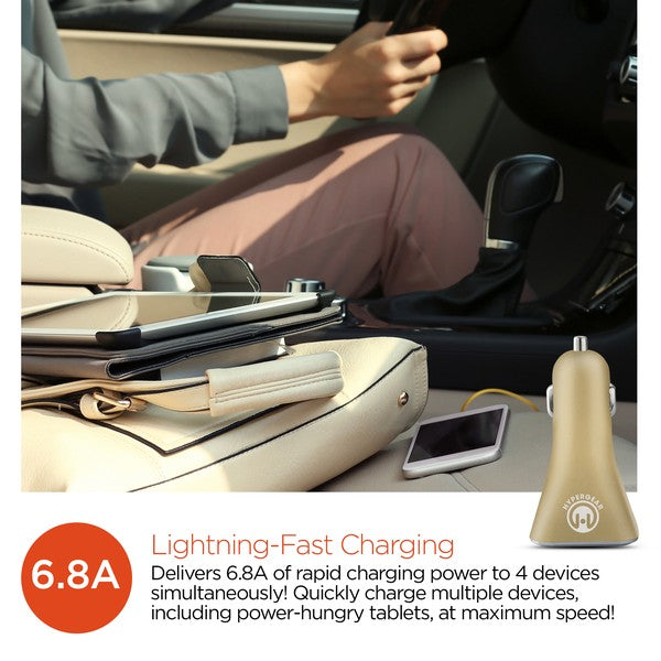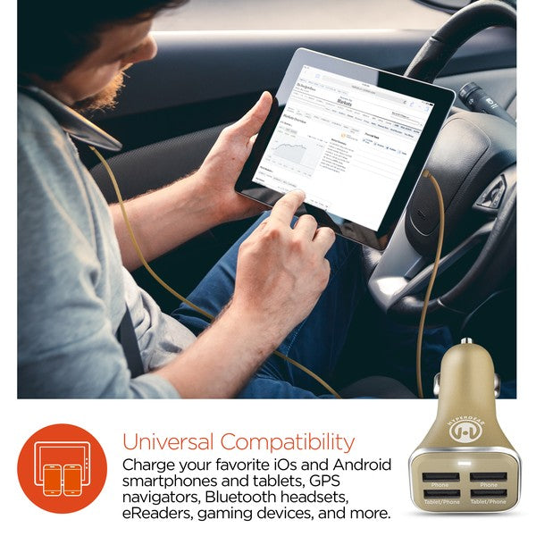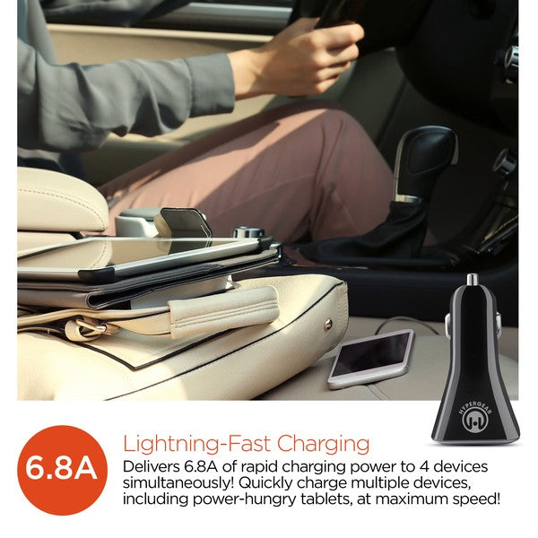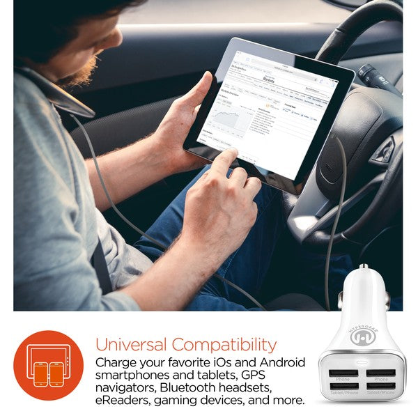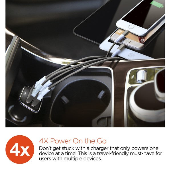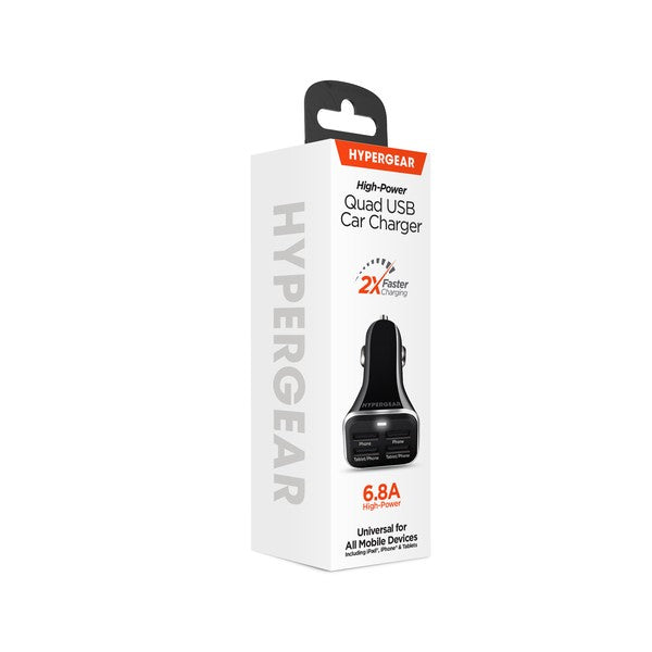 The High-Power Quad USB Car Charger delivers colossal performance from a pocket-sized device. Perfect for power-heavy mobile lifestyles, it features 4 USB ports with an incredible 6.8A combined output.