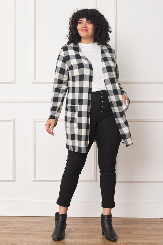 EKJ1066 Red Long Buffalo Plaid Open Cardigan