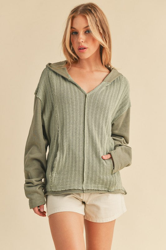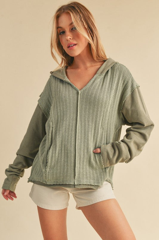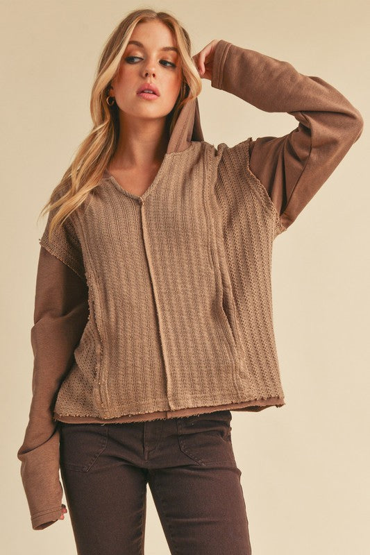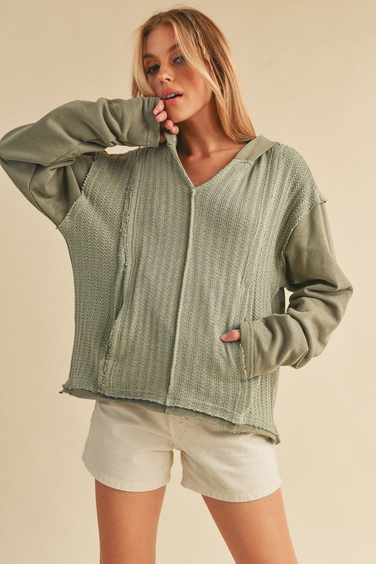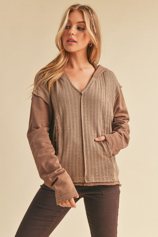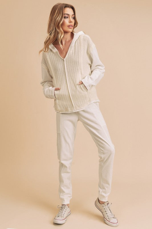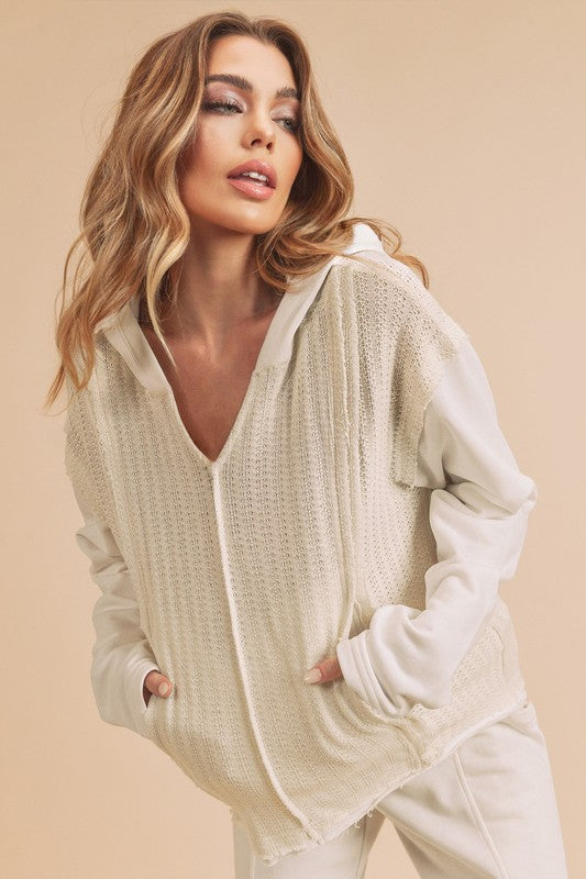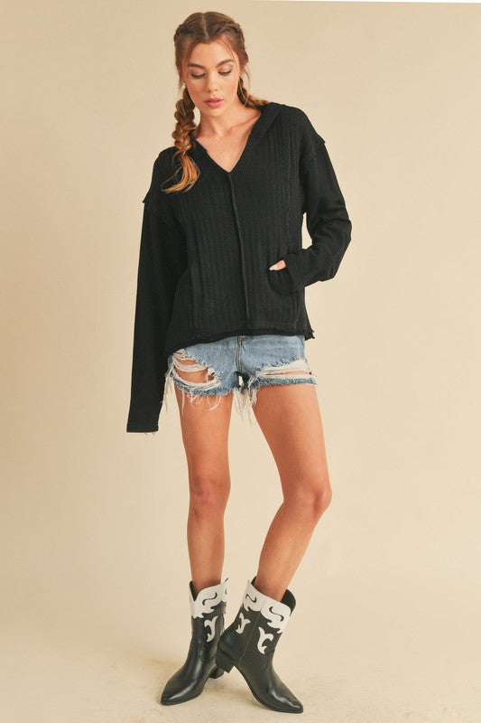 Retro and edgy, the Raquel hoodie pullover features a classic waffle-knit fabrication with front pockets and exposed seaming throughout for a true lived-in look.