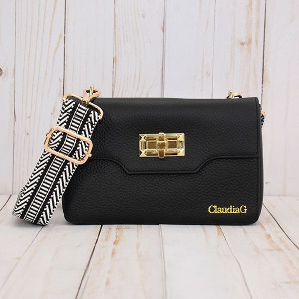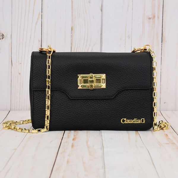 Just the right fit to keep your essentials organized beneath a graceful flap-front closure. Made in genuine leather with gold hardware. Black interior lining with inside pocket.