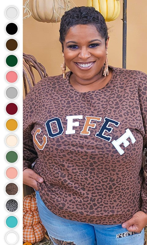 Letter Patch Soft Chenille sweatshirt design features COFFEE arched in a Cozy Mix Chenille.