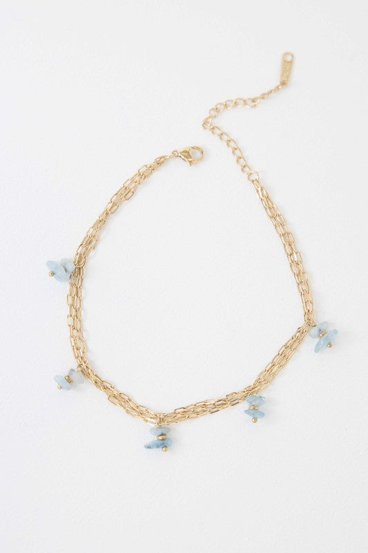 A three chained necklace with blueish grayish stone charms.