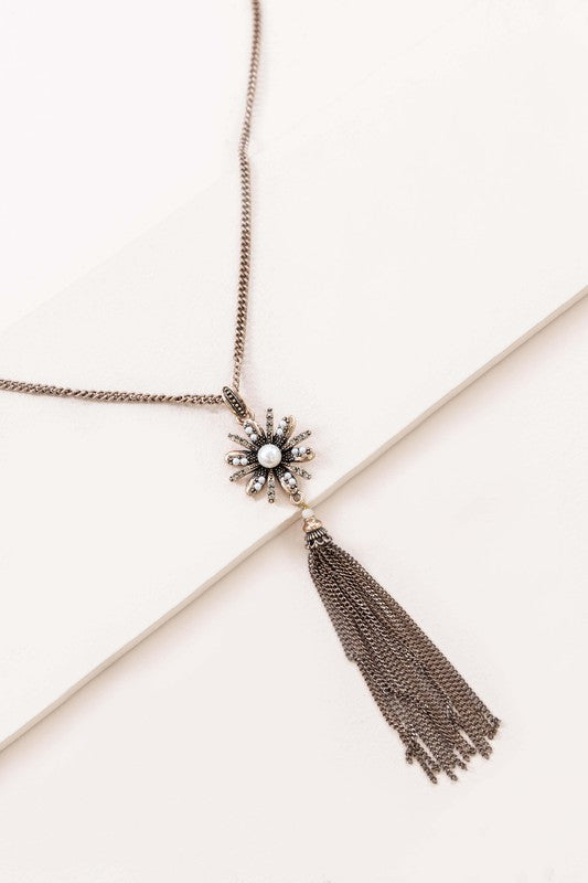 Chic dark chained necklace featuring a free-flowing tassel and floral pendant.