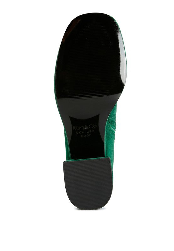 Mid High block heeled comfortable and plush ankle boot, crafted in stretchable fine suede is class apart. Comes in trendy square cut toe and block heels, this pair is easy to wear with a side zipper opening.